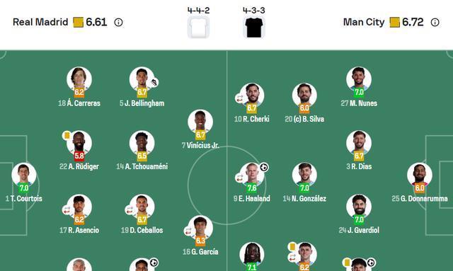 曼城2-1皇马,球员评分出炉:不是哈兰德获第一,最差之人无争议